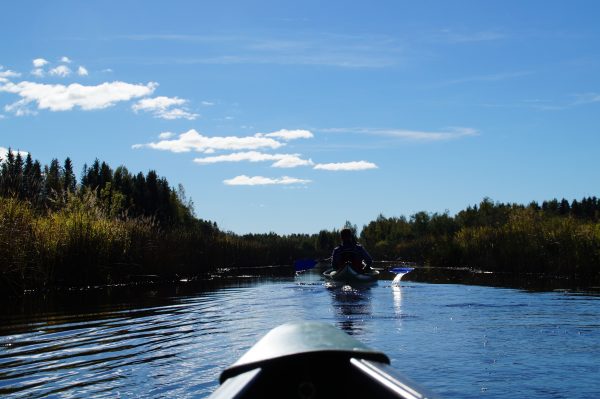 Päiväretkemme kohokohta oli melontaretki Purolomien Jussin opastuksella. Otimme yhdessä kanootit rantaan, kävimme läpi turvallisuusohjeistuksen ja nousimme vesille pareittain. Jussi oli varannut meille aikataulusyistä lyhyemmän ja aloittelijoille sopivamman melontareitin.